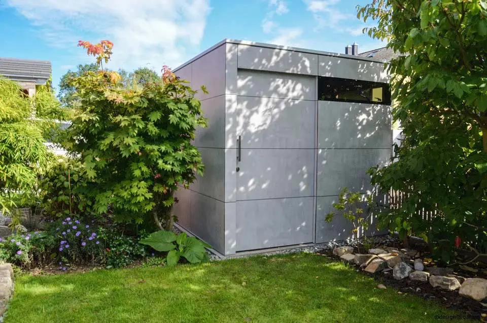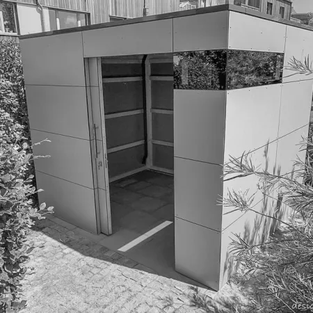 The cubist tool shed, measuring up to 9 m² with a weatherproof HPL façade, is a real space saver. Available to