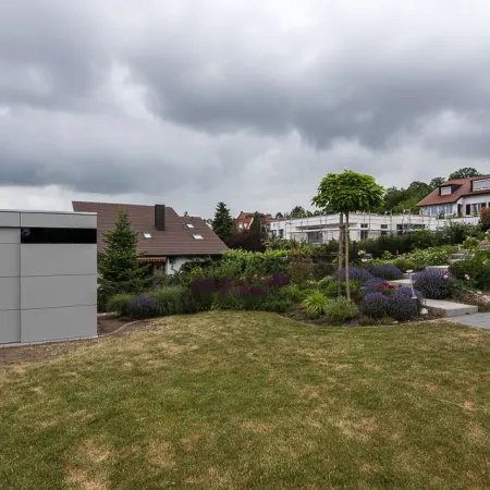 The HPL (high-pressure laminate) cladding is the heart of our sheds. The material is extremely durable, weather-resistant and UV-stable. The biggest advantage in everyday use: it is absolutely easy to maintain. While wooden sheds need to be painted regularly, the HPL façade remains colourfast and beautiful for decades. In contrast to thin-walled and lightweight aluminium sheds, the solid medium-sized garden shed also reliably withstands hail and storms.