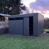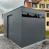 A garden shed has been built in Bochum that impressively demonstrates how an architect-designed garden shed can serve as a logical continuation of the residential architecture. With its generous dimensions of 390 cm wide and 250 cm deep, the anthracite-coloured building blends perfectly into the modern ensemble. While classic wooden sheds often look like an afterthought in the garden, this solution impresses with its clean lines and cubic design, which underlines and enhances the architectural concept of the property.