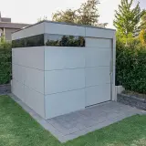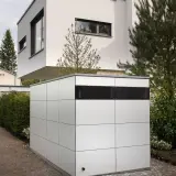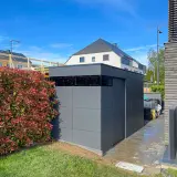 This designer garden shed in Capellen, Luxembourg, was customised with a special depth of 1.80 m to fit the available space perfectly. This ensures that the walkways between the house and the garden shed remain wide enough and that the available storage space is used optimally. The garden shed blends harmoniously into its surroundings and makes perfect use of the conditions on site.