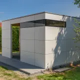 The garden is laid out on different levels, with the garden shed set back slightly in the background. Its white design and ESG glazing give it a light and unobtrusive appearance, and despite its modern form, it does not impose itself. It complements the design instead of competing with the pool for attention.