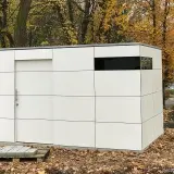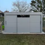 A project was carried out in Augsburg-Göggingen that shows just how versatile a minimalist garden shed with a flat roof can be. With impressive dimensions of 450 cm in width and 300 cm in depth, this is one of the largest standard models, yet its clean lines give it a light and modern look. The medium grey colour scheme enhances the contemporary look and allows the structure to blend harmoniously with the surrounding garden landscape. The height of 245 cm creates an airy feeling inside, while the large sliding door ensures easy access even for bulky items such as garden furniture or bicycles.