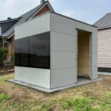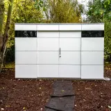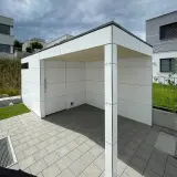 The focus of this project was on high everyday practicality. With an area of almost 10 m², the custom-made garden shed offers sufficient space for extensive equipment. A key detail is the wide double sliding door, which has been dimensioned so that even a ride-on lawn mower or bulky garden furniture can be easily moved in and out. The simple white colour scheme gives the garden shed a pleasant lightness, while two flush-mounted glazed panels provide sufficient daylight inside. The result is a functional work and storage room that blends in perfectly with a modern garden design.