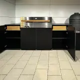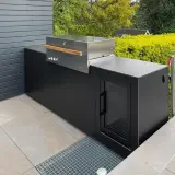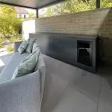 Nous avons conçu cette petite cuisine d'extérieur pour vous permettre de profiter des joies du barbecue sans encombrer votre espace. Le barbecue encastrable Napoleon massif, doté de 4 brûleurs et d'un brûleur arrière, a été intégré de manière à ce que la surface de cuisson soit à la hauteur du plan de travail. Grâce à cet emplacement centré, le corps extérieur peut être utilisé dans toute sa hauteur. Il offre un espace de rangement suffisant pour les accessoires de barbecue, les coussins, les sets de table, etc. La bouteille de gaz est placée dans le corps central, juste sous le barbecue, et est facilement accessible. Le corps en HPL gris résistant aux intempéries est non seulement élégant, mais aussi extrêmement robuste. Il est donc parfaitement adapté aux conditions météorologiques et conçu pour une véritable « cuisson pratique ».