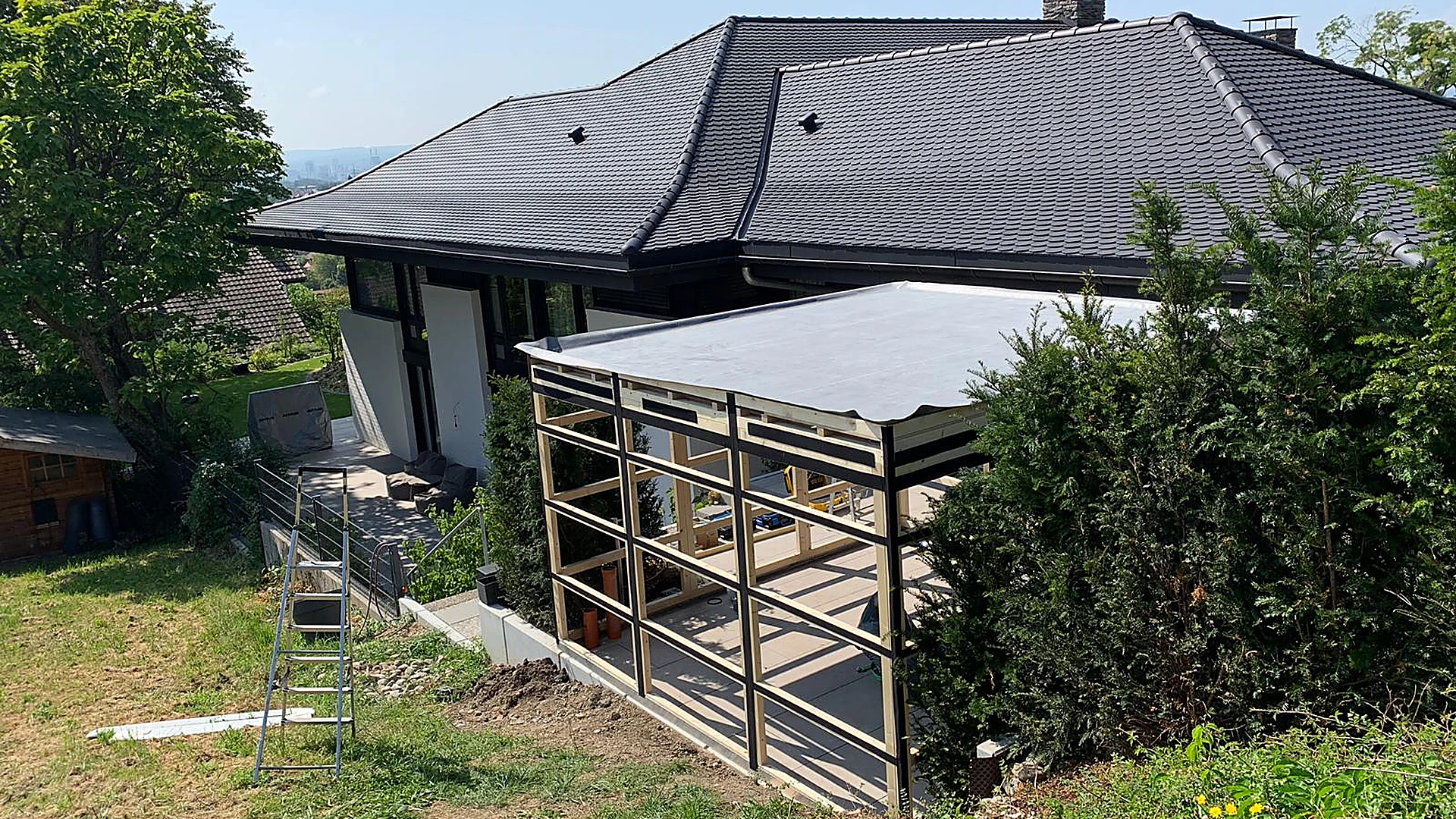 Die Folie wird nicht lose verlegt, sondern vollflächig mit dem Untergrund verklebt. Das unterbindet eine Sogwirkung bei starkem Sturm und verhindert Flattergeräusche der Dachhaut – ein Detail, das bei günstigeren Konstruktionen oft übersehen wird und im Alltag zu hörbaren Qualitätsunterschieden führt. Die vollflächige Verklebung stellt zudem sicher, dass sich unter der Folie kein Kondenswasser sammeln kann, was die Lebensdauer der Holzkonstruktion darunter zusätzlich schützt.