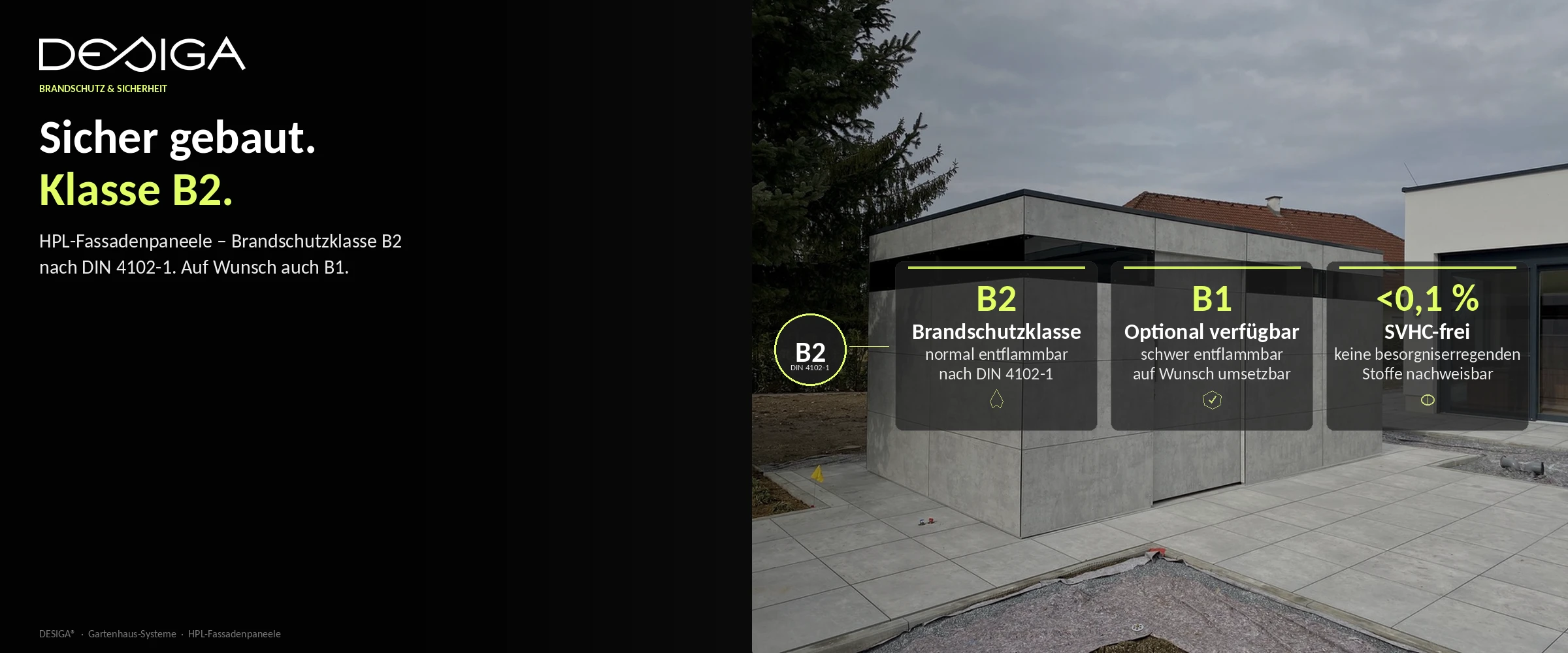 Sicherheit ist bei jedem Außenbau ein wichtiges Thema, besonders bei einer Platzierung nah an der Grundstücksgrenze. Die von uns verwendeten Fassadenpaneele erfüllen die Anforderungen der Brandschutzklasse B2 (normal entflammbar) nach der deutschen Norm DIN 4102-1. Dies entspricht dem bewährten Sicherheitsstandard für Bauprodukte im Gartenbereich und bietet einen zuverlässigen Schutz für Ihr Eigentum. Auf wunsch sind die Paneele auch in der Brandschutzklasse B1 umsetzbar. Zusätzlich sind unsere Paneele auf ökologische Unbedenklichkeit geprüft: Sie enthalten keine besonders besorgniserregenden Stoffe (SVHC) in einer Konzentration über 0,1 %. Damit entscheiden Sie sich für ein Produkt, das Mensch, Tier und Natur gleichermaßen respektiert.
