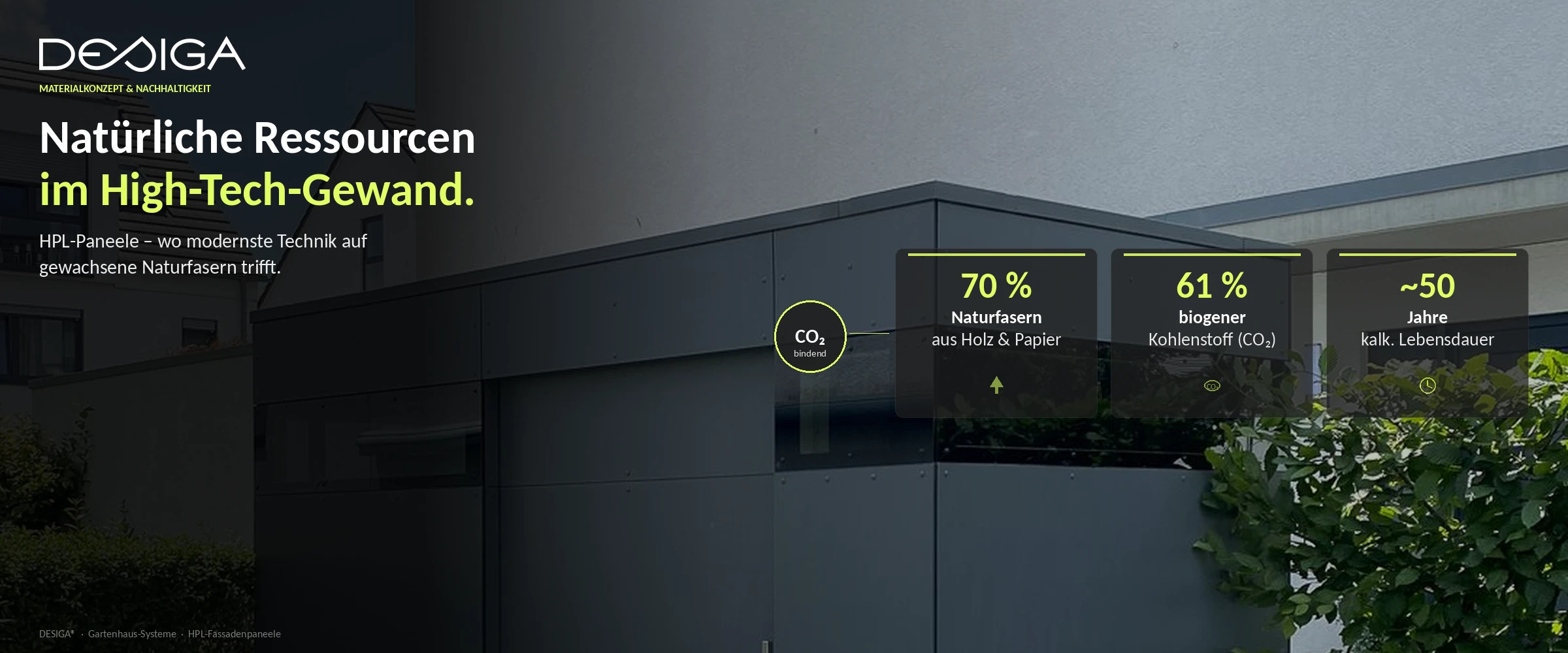 Obwohl die Fassade Ihres HPL-Objekts wie ein industrielles Hochleistungsprodukt wirkt, besteht sie zu einem Großteil aus Natur. Etwa 70 % der Paneele basieren auf Fasern, die von Holz oder Papier stammen. Durch diesen hohen Anteil an nachwachsenden Rohstoffen binden die Paneele aktiv CO2 – der biogene Kohlenstoffanteil liegt bei beachtlichen 61 %. In Kombination mit einer kalkulatorischen Lebensdauer von etwa 50 Jahren ist diese moderne Raumlösung eine der nachhaltigsten Investitionen für Ihren Garten.