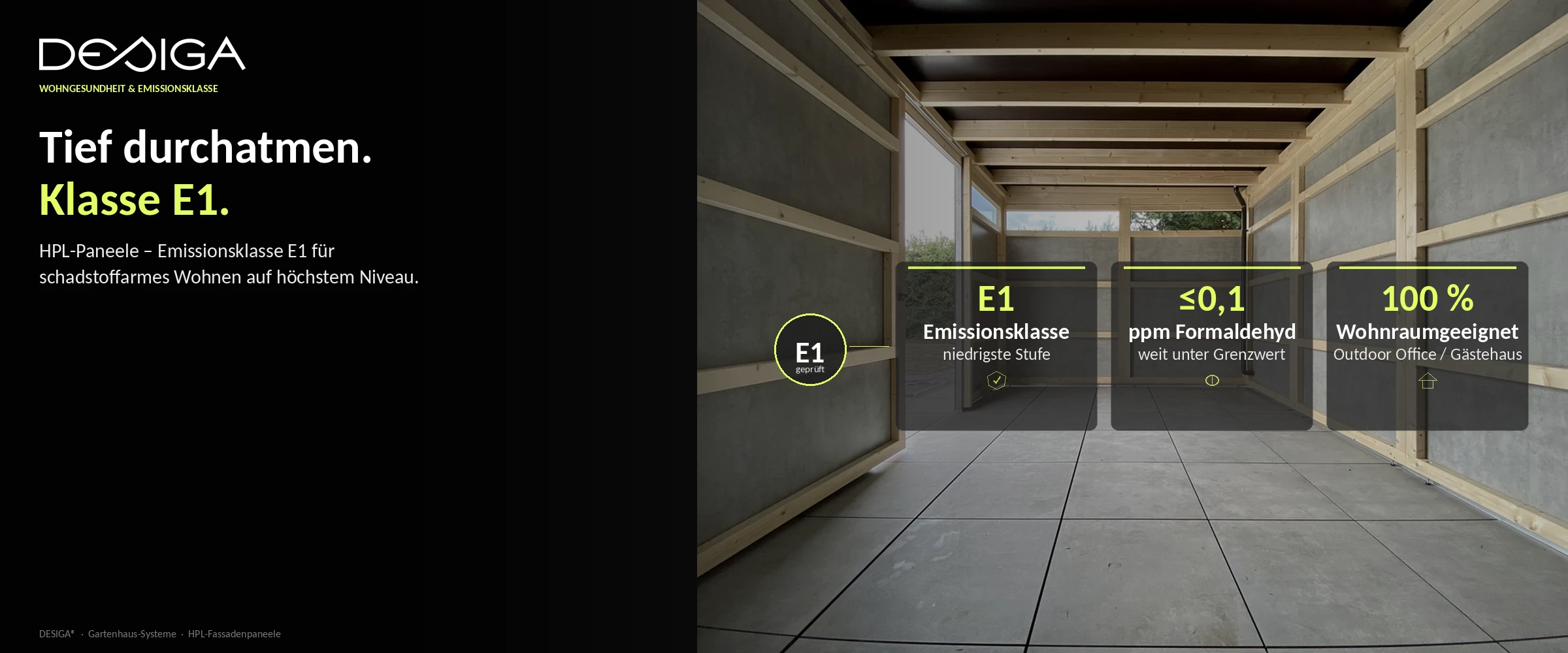 Besonders wenn Sie Ihr modernes Gartenhaus als Homeoffice, Atelier oder Hobbyraum nutzen, ist die Luftqualität im Inneren entscheidend. Unsere Materialien erfüllen die strengen Anforderungen der Emissionsklasse E1.