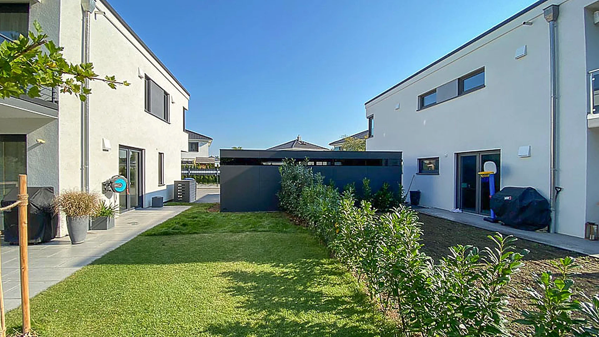 Ein weiteres Kriterium für die Privilegierung an der Grenze ist die mittlere Wandhöhe, die 3 Meter nicht überschreiten darf. Da unsere Konstruktionen in den Standardhöhen von 2,25 m bis 2,90 m gefertigt werden, bleiben wir konstruktionsbedingt immer unter dieser kritischen Marke. Damit entfällt für unsere Kunden die Notwendigkeit, komplizierte Abstandsflächen zu berechnen oder beim Nachbarn um Zustimmung für eine Unterschreitung zu bitten.