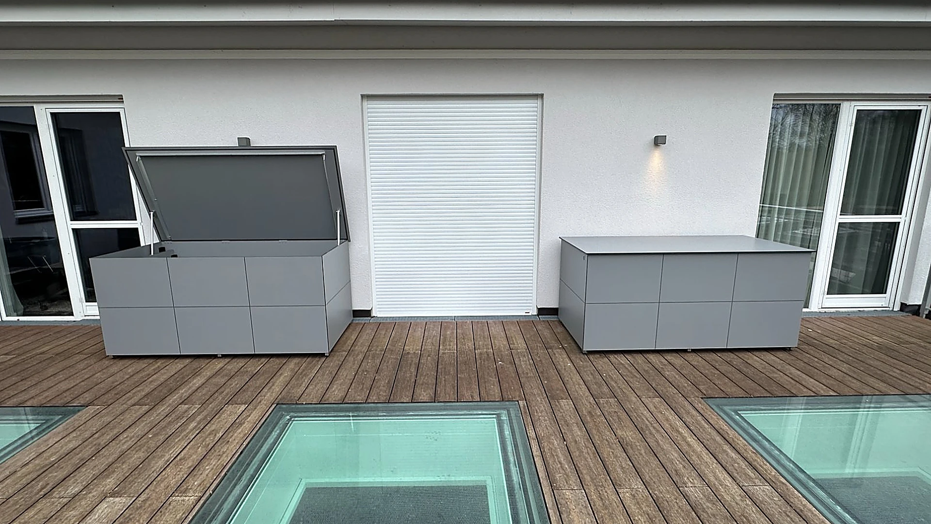 - Optionale Mobilität: Anstelle der festen Edelstahl-Stellfüße können wir die Gartenbox mit hochwertigen Rollen ausstatten. Dies ermöglicht es, das Möbel auf ebenen Flächen flexibel zu verschieben.