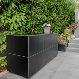 Realizzata in HPL (High Pressure Laminate) di alta qualità, questa soluzione di stoccaggio su misura offre la massima resistenza agli agenti atmosferici. Il materiale è stato appositamente progettato per un uso prolungato all'aperto: è estremamente facile da pulire, resistente ai raggi UV e sopporta senza problemi il gelo e la pioggia senza perdere la sua brillantezza cromatica. Con una larghezza di 180 cm, il modulo offre ampio spazio per le attrezzature, mentre la lavorazione precisa sottolinea l'esigenza di design. L'oggetto combina così l'assenza di manutenzione permanente con un design senza tempo per concetti outdoor sofisticati.
