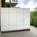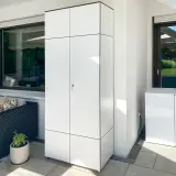 In questo caso, un armadio alto a quattro ante viene utilizzato come soluzione centrale per la manutenzione della piscina. Lo scomparto sinistro funge da armadio specializzato per l'attrezzatura tecnica della piscina, che ripone i componenti tecnici in modo protetto e ordinato. Grazie alla sua struttura robusta, l'armadio soddisfa perfettamente tutti i requisiti necessari per lo stoccaggio di sistemi di filtraggio e controllo sensibili e si integra con discrezione nel design moderno del giardino.