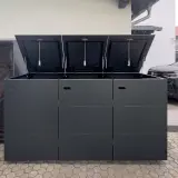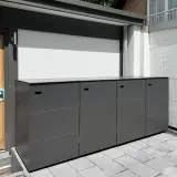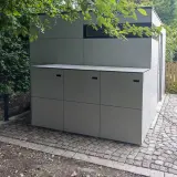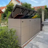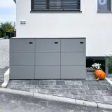 Questo box per tre bidoni della spazzatura da 240 litri è disponibile in una speciale finitura HPL con effetto acciaio Corten. Il decoro unisce la superficie vivace e ricca di sfumature dell'acciaio Corten ai vantaggi pratici dell'HPL: nessuna macchia di ruggine, nessuna manutenzione complessa. Il box si integra perfettamente nel quadro d'insieme dei toni terrosi del pavimento e della facciata della casa e crea un elegante contrasto con le piante verdi.