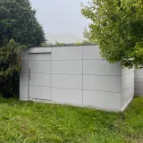 Das Gartenhaus in Corten-Optik bietet den charakteristischen Look von Cortenstahl, ohne Nachteile wie Abfärben oder aufwendige Pflege. Es bleibt langfristig ansprechend und ist perfekt auf die Umgebung abgestimmt. Durch die Verwendung von Sturmankern bleibt es auch bei hoher Windlast stabil und meistert die rauen Küstenbedingungen problemlos. Der Kontrast zwischen der warmen Corten-Optik und der Umgebung aus Sand, Meer und Grünflächen sorgt für ein harmonisches Gesamtbild.