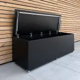 Die Kombination aus Gartenbox und Sideboard steht in unmittelbarer Nähe der Außendusche und macht dort gleich doppelt Sinn. Zum einen nehmen beide Elemente vor Ort die Breite des integrierten Holzlagers in der Wand auf und ergeben ein symmetrisches, harmonisches Bild. Zum anderen funktionieren sie ganz praktisch als Ablage für Duschgel und Zubehör, während im Inneren Polster und Co. zuverlässig vor Spritzwasser und Duschnässe geschützt bleiben. So entsteht eine Lösung, die nicht nur gut aussieht, sondern genau an diesem Platz echten Mehrwert liefert: aufgeräumt, wassernah nutzbar und dauerhaft pflegeleicht.