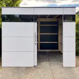 In engen Durchgängen oder dem Bereich zwischen Wohnhaus und Straße zählt jeder Zentimeter. Ein modernes Gerätehaus mit Dachbegrünung beweist hier seine Flexibilität, da die Konstruktion eine Montage unmittelbar an der Hauswand erlaubt. So wird wertvoller Platz bestmöglich ausgenutzt, der sonst oft ungenutzt bleibt. Diese wandbündige Lösung schafft diskreten Stauraum für Fahrräder oder Gartengeräte, ohne die Laufwege einzuschränken. Durch die schlichte Linienführung fügt sich das Gebäude unaufdringlich in das Gesamtbild ein und sorgt für ein ruhiges, aufgeräumtes Erscheinungsbild direkt am Haus.