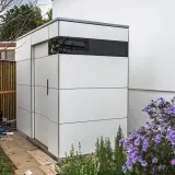 Die Verwendung von hochwertigem High Pressure Laminate (HPL) sorgt dafür, dass die Fassade über Jahre hinweg ihre Farbechtheit und Formstabilität behält, ohne jemals einen Pinselstrich Farbe zu benötigen. Dank der Witterungsbeständigkeit und UV-Resistenz bleibt der cube Gartenschuppen absolut wartungsfrei und trotzt sowohl starkem Regen als auch intensiver Sonneneinstrahlung mühelos. Die schlichte Eleganz der Oberfläche unterstreicht den modernen Charakter der Architektur und garantiert eine dauerhaft gepflegte Optik, während das Innenleben zuverlässig vor Feuchtigkeit geschützt bleibt. So entsteht eine nachhaltige Stauraumlösung, die Funktionalität, Beständigkeit und individuellen Stil perfekt vereint.