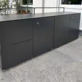 Diese Referenz zeigt eindrucksvoll, wie ein Gewerbeobjekt durch gezielten Einsatz von hochwertigem Stauraum aufgewertet werden kann. Die gewählten Sideboards dienen hier als repräsentativer Geräteschrank für den Außenbereich. Das Unternehmen profitiert dabei von einem doppelten Nutzen: Einerseits verschwinden notwendige Utensilien ordentlich hinter den Fronten, andererseits unterstreicht das minimalistische Design die moderne Erscheinung des Firmengeländes. Es ist die ideale Lösung für Betriebe, die Wert auf eine aufgeräumte Visitenkarte im Außenbereich legen.