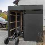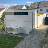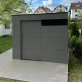 Bei der Planung dieses Objekts stand die optimale Ausnutzung der Innenfläche im Fokus. Die Schiebetür wurde bewusst mit einem Abstand von 50 cm zur Seitenwand positioniert. Dieser scheinbar kleine planerische Kniff schafft im Inneren den notwendigen Raum, um durchgehende Wandregale zu installieren, ohne den Laufweg oder den Öffnungsmechanismus der Tür zu blockieren. In Kombination mit der dezenten Verglasung entsteht so ein heller, funktionaler Gartenraum, der trotz kompakter Außenmaße ein beeindruckendes Maß an geordnetem Stauraum bietet.